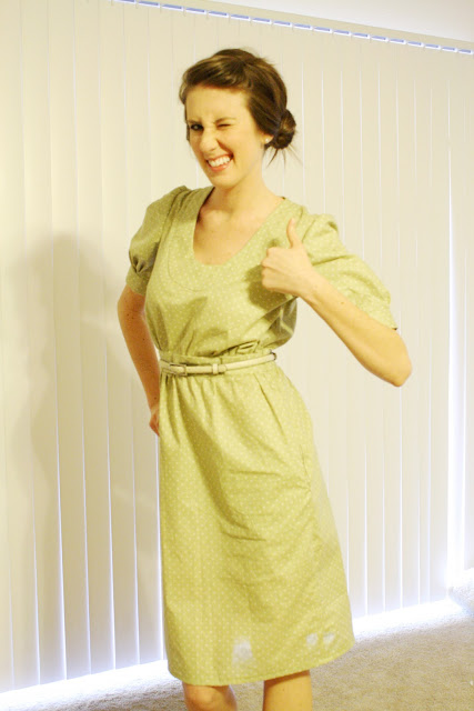 I really like the shape of the skirt, it's flattering and classic. Unfortunately this dress is actually a tad too big for me by one or two sizes. Whoops! So it should be a bit more fitted than it is. I was really sad about that when I tried it on for the first time. The pattern size to body measurements are never the same from one pattern to the next. It's a little frustrating, I even went down a size from my holiday dress which was also too big. Fortunately in that case I was able to easily size it down with a couple of quick alterations, but I can't do that with this green dress without completely taking it apart. Oh well! I'm hoping after a few washes it will shrink up a bit since it is cotton. And I added a little belt to cinch up the waist a bit.